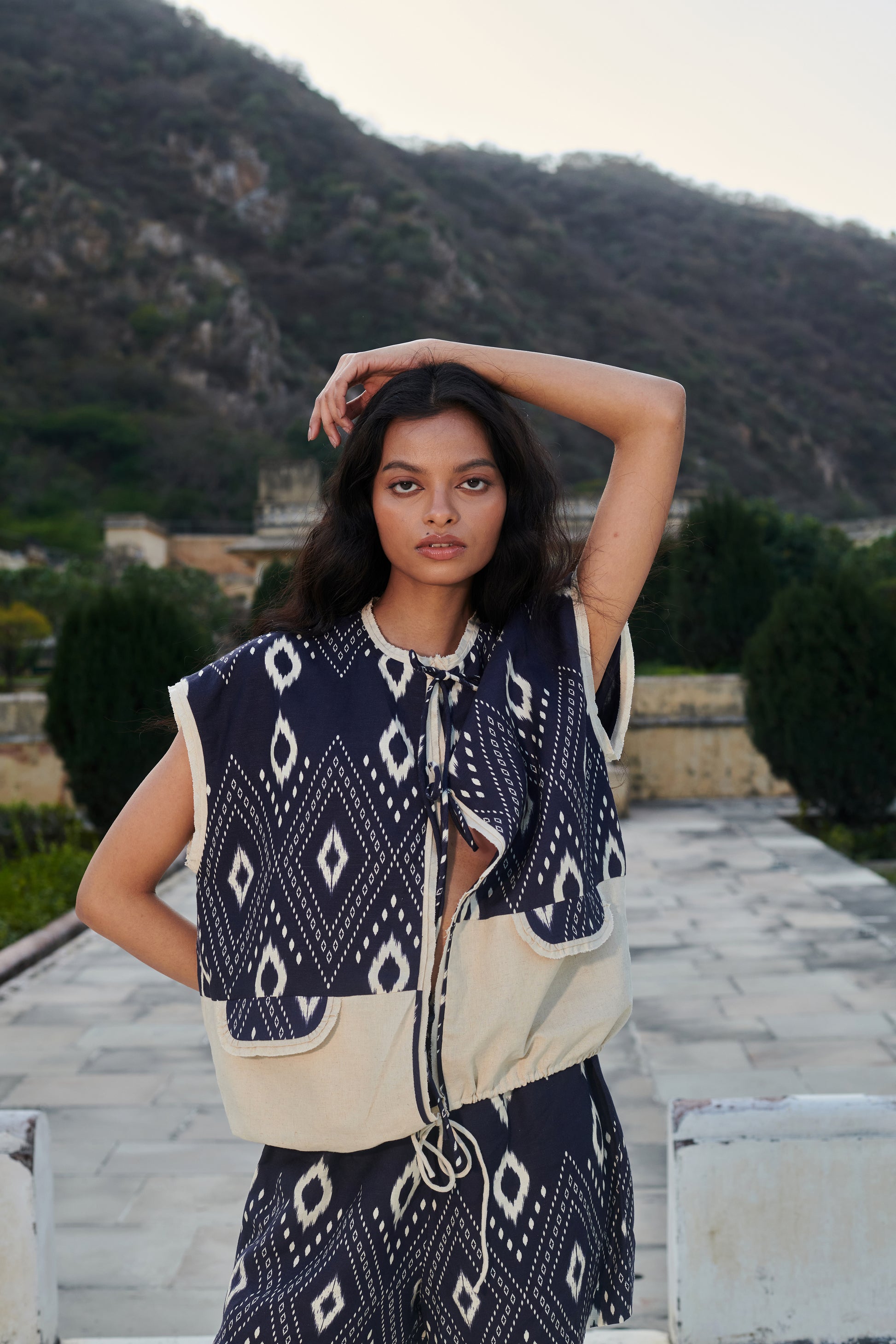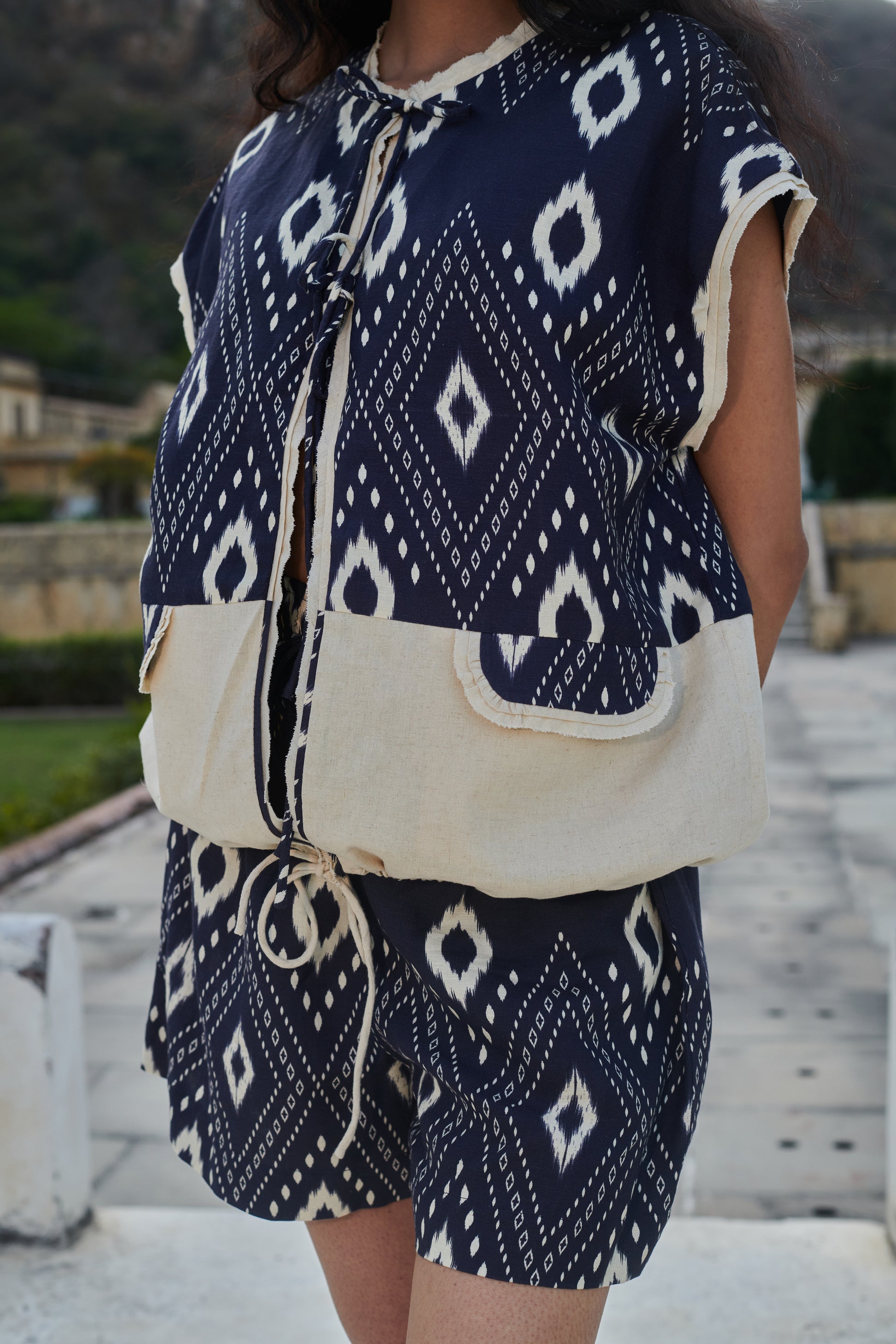 The Aomi Tie Front Abstract Top is designed with intricate detailing, tie string front and geometric motifs in luxurious navy blue and beige colours.
