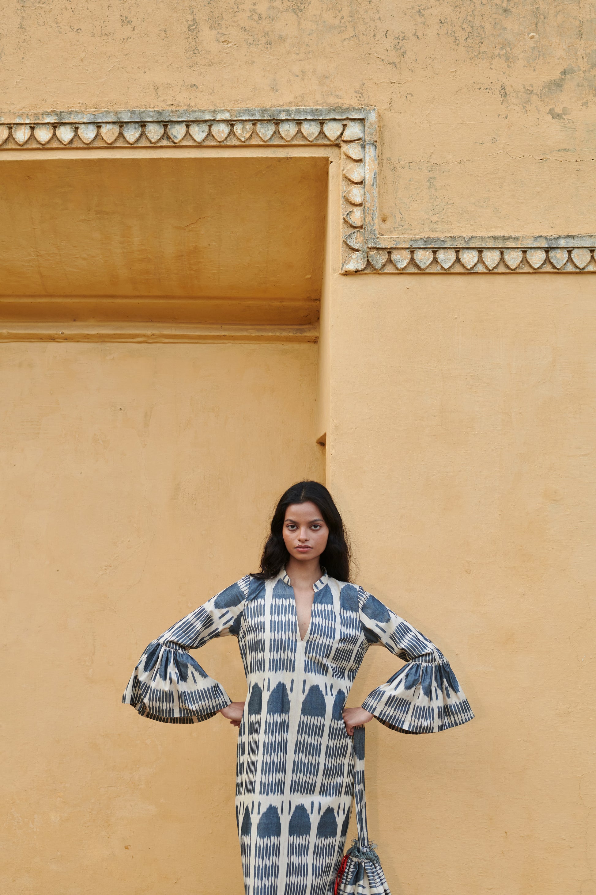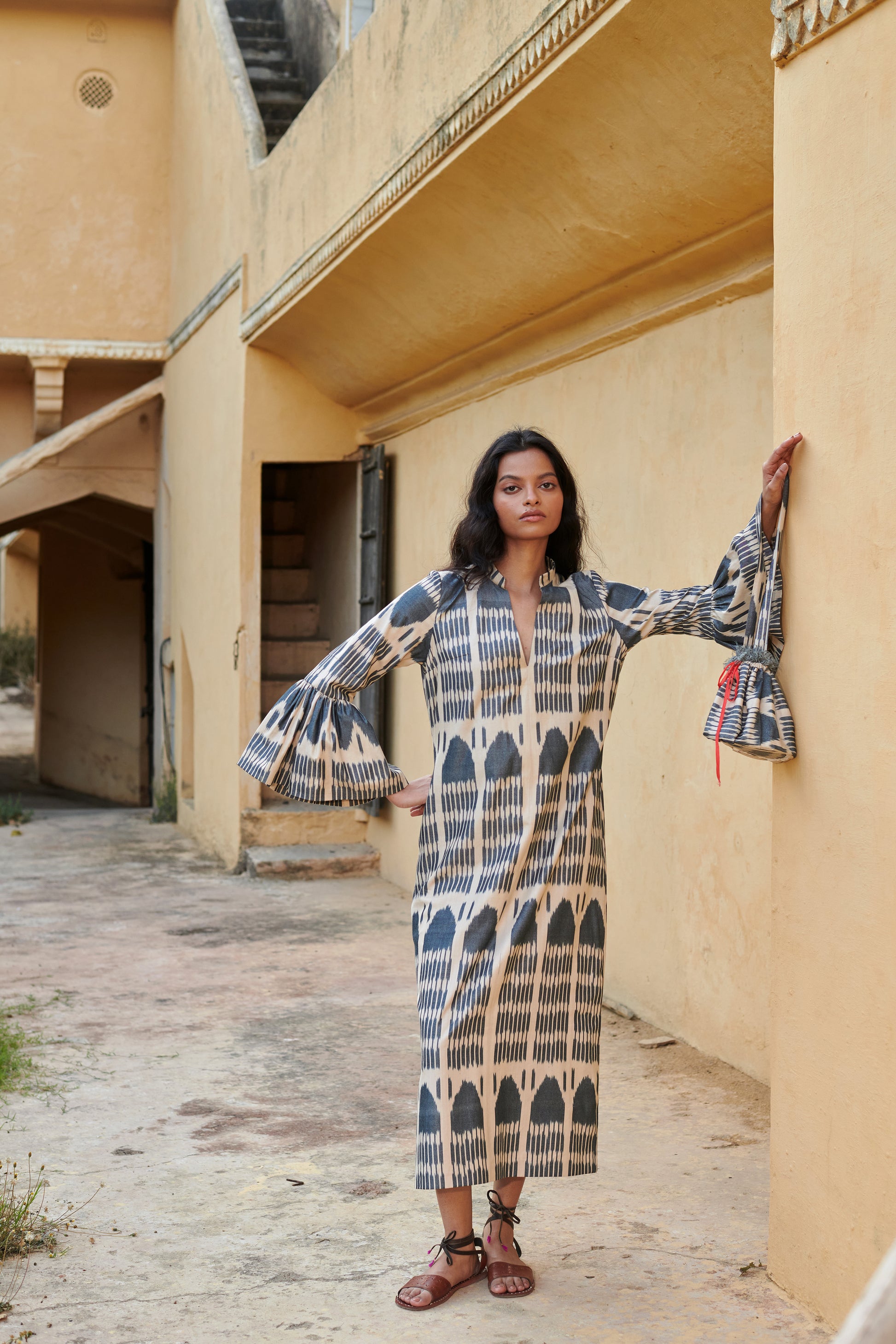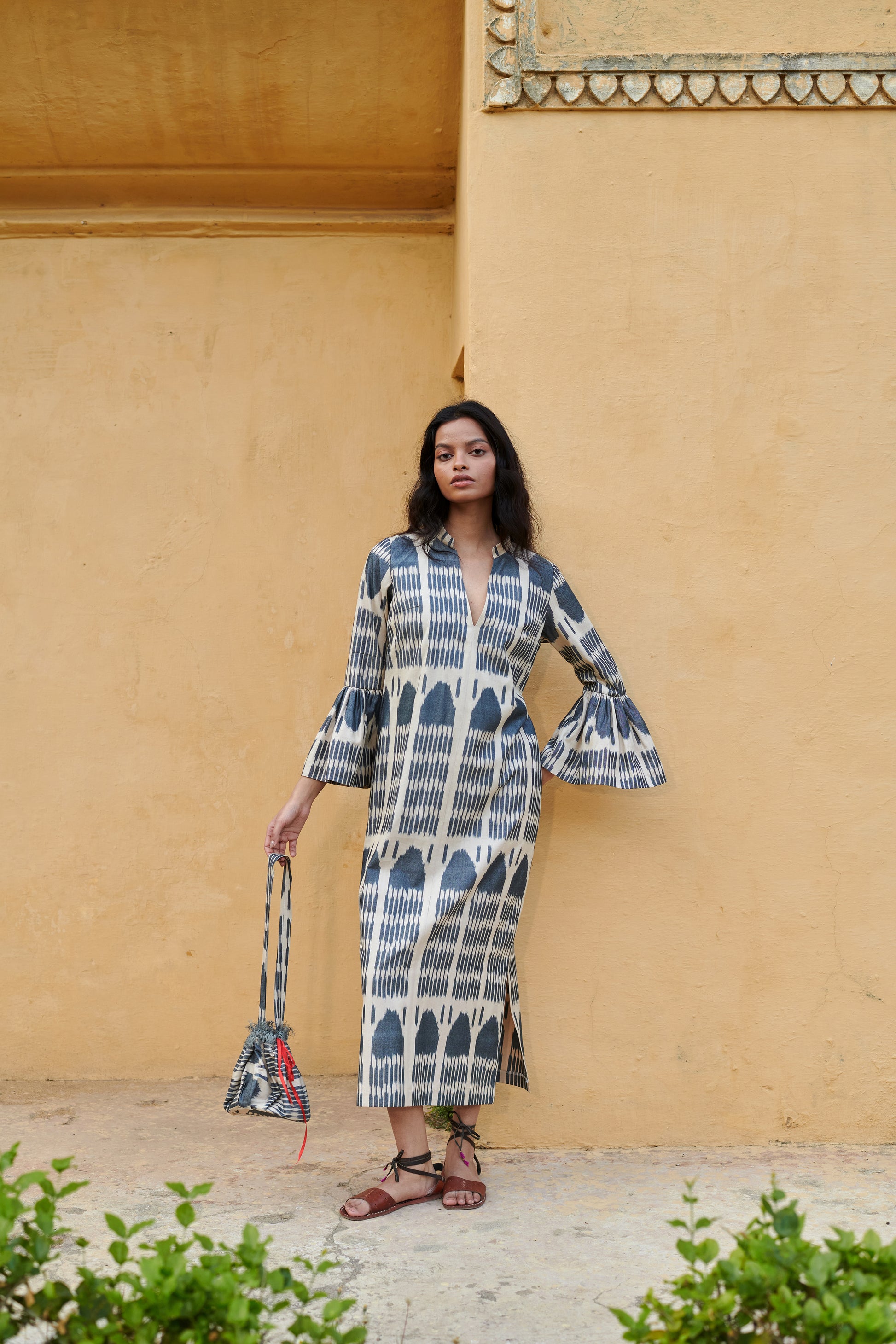 Patterned in a unique ikat print, the Gulmohar Dress boasts a V neckline and side slits. Delicately crafted, this dress is perfect for any occasion. Wear yours with flat or heeled sandals.