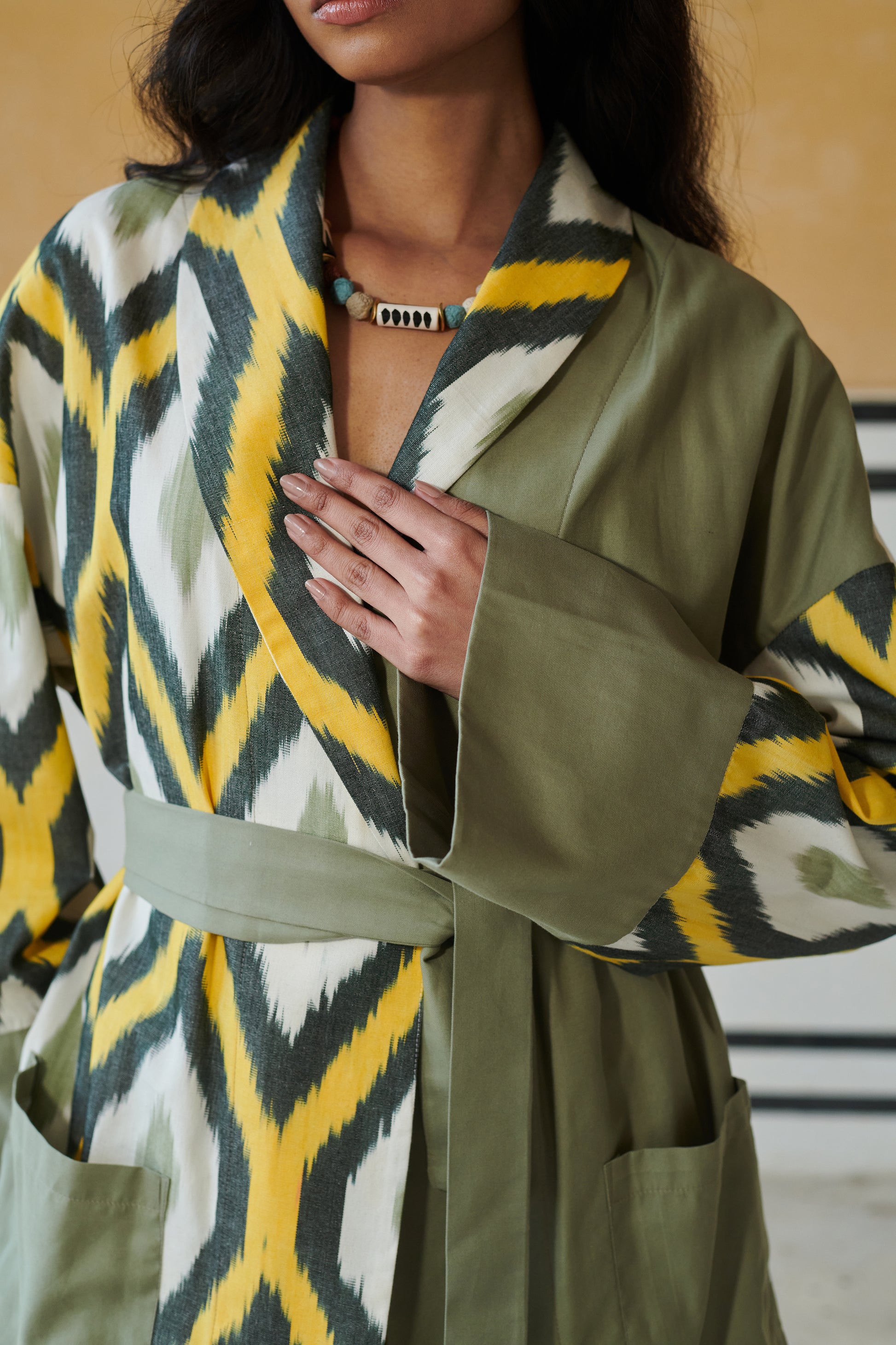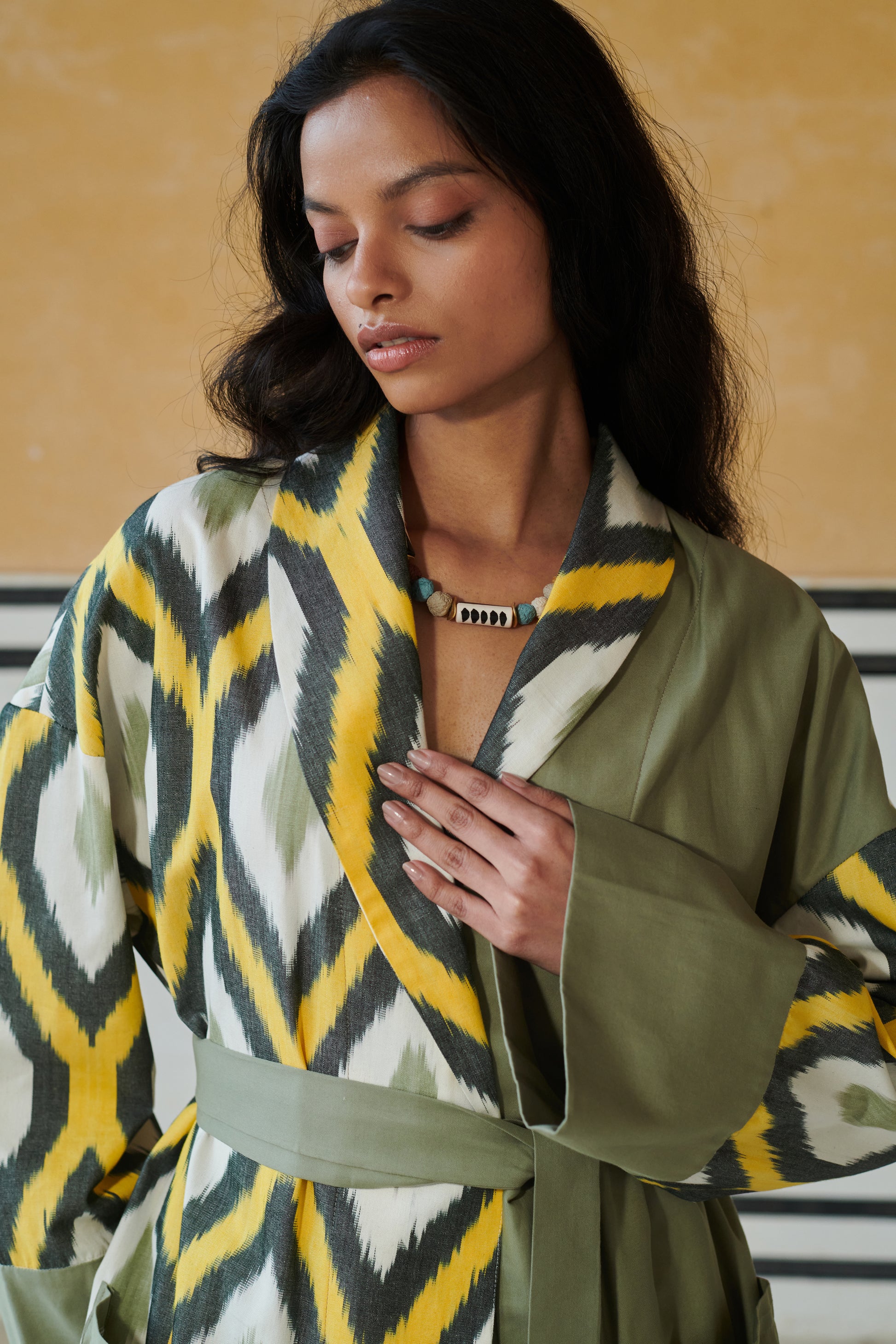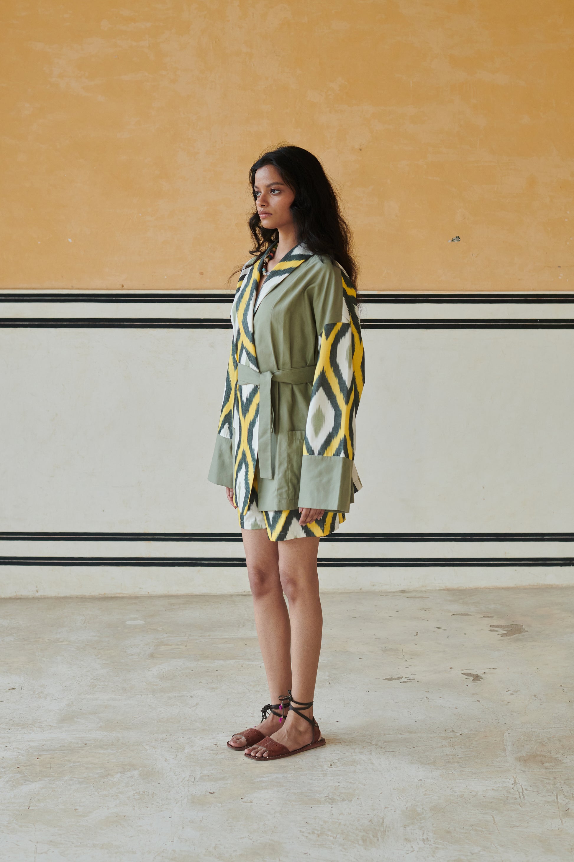 Belted kimono jacket and matching shorts set with a colour block feature adds a touch of elegance to its green and yellow abstract pattern. Style this one with sandals for a relaxed daytime look or dress it up with statement accessories for an evening out.