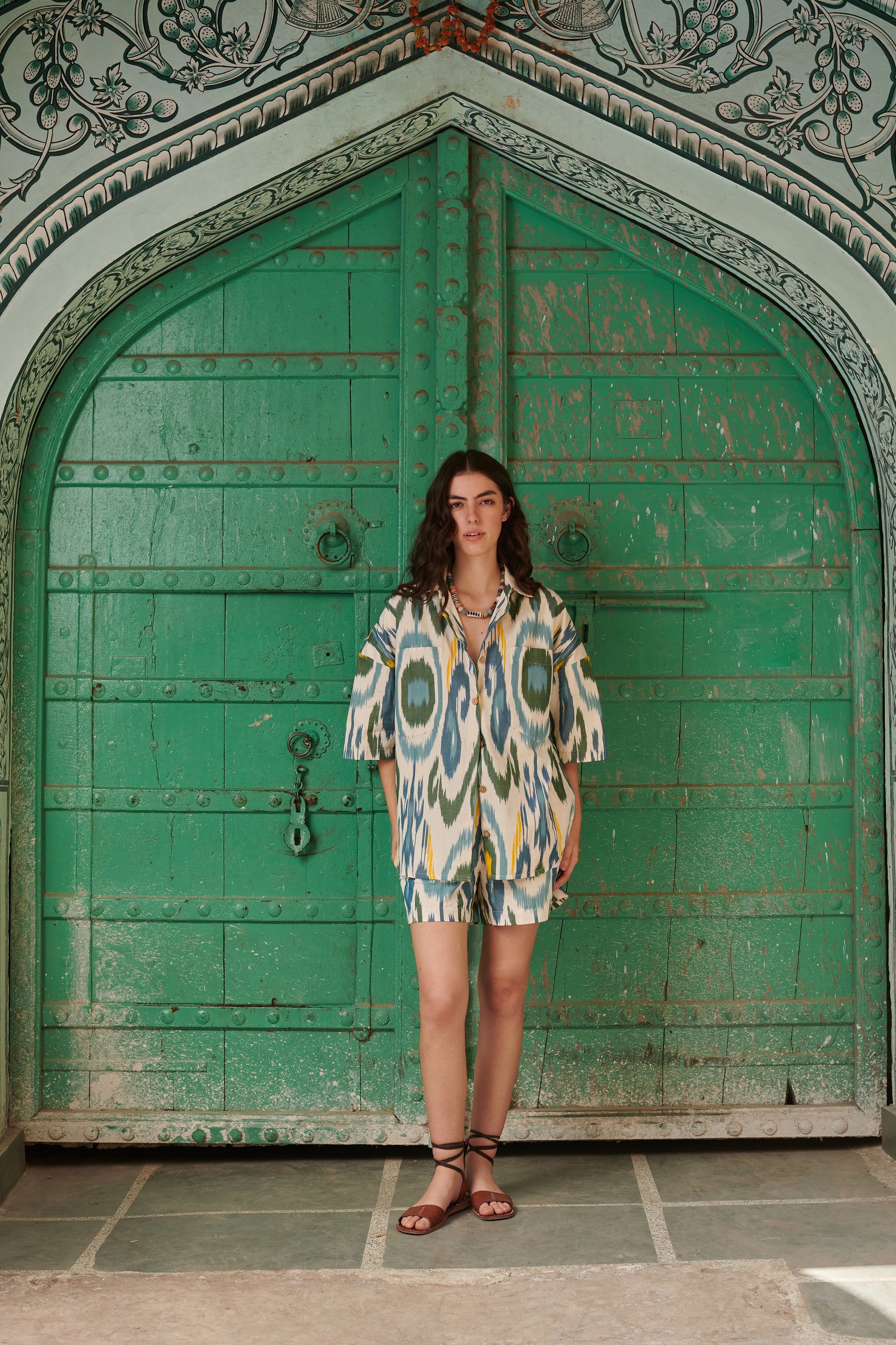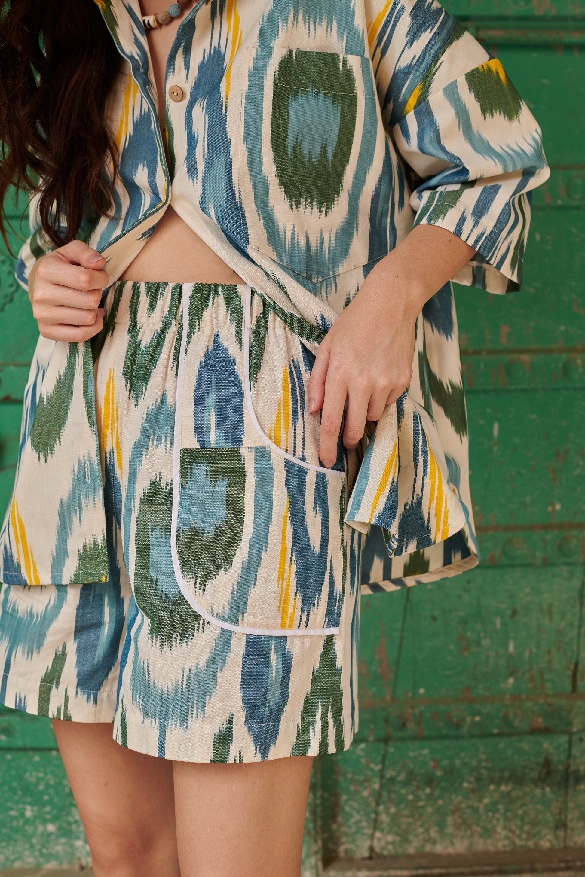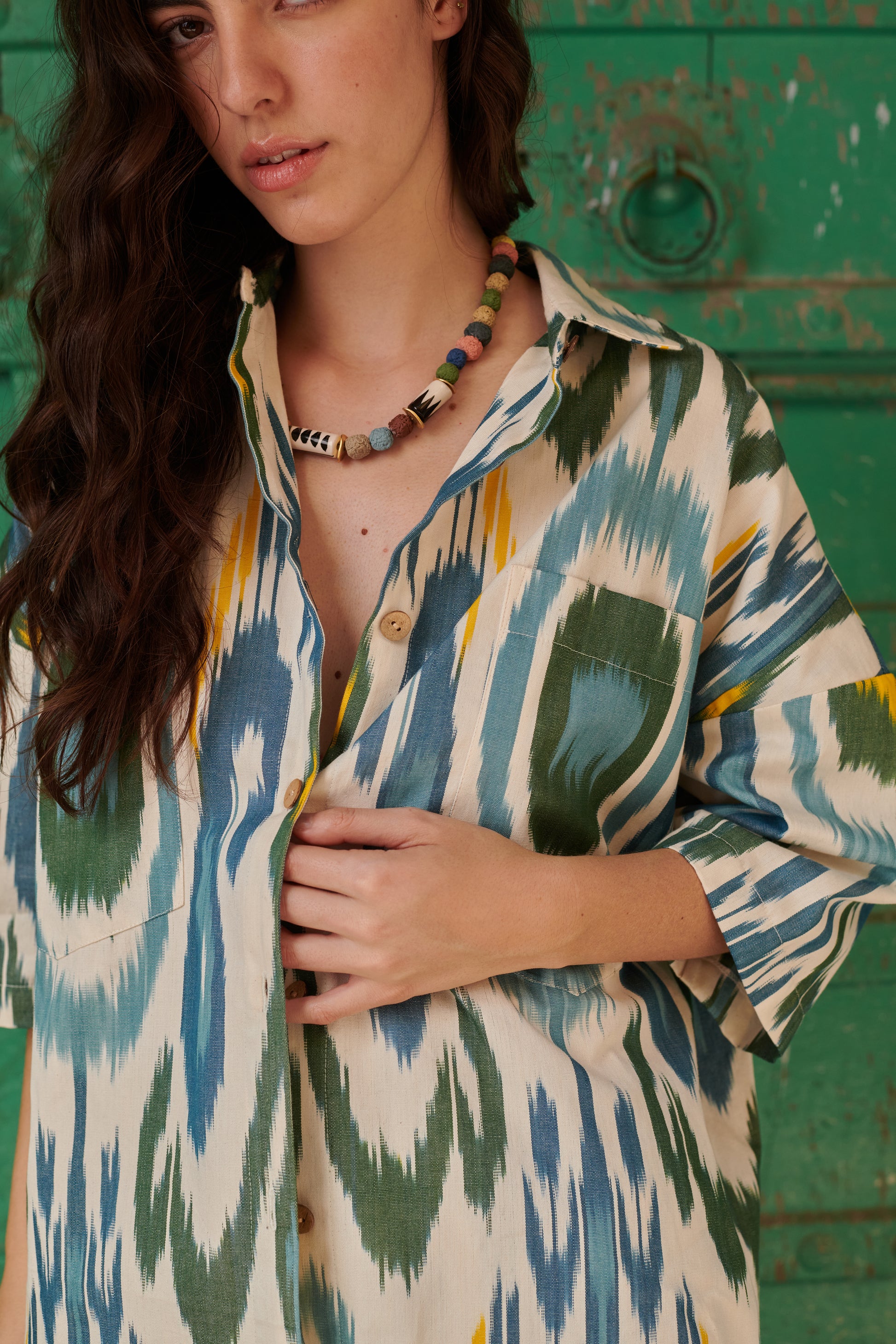 This versatile emerald, blue and yellow Nyanza Jungle Shirt has a button down relaxed fit. A perfect addition to your summer wardrobe.