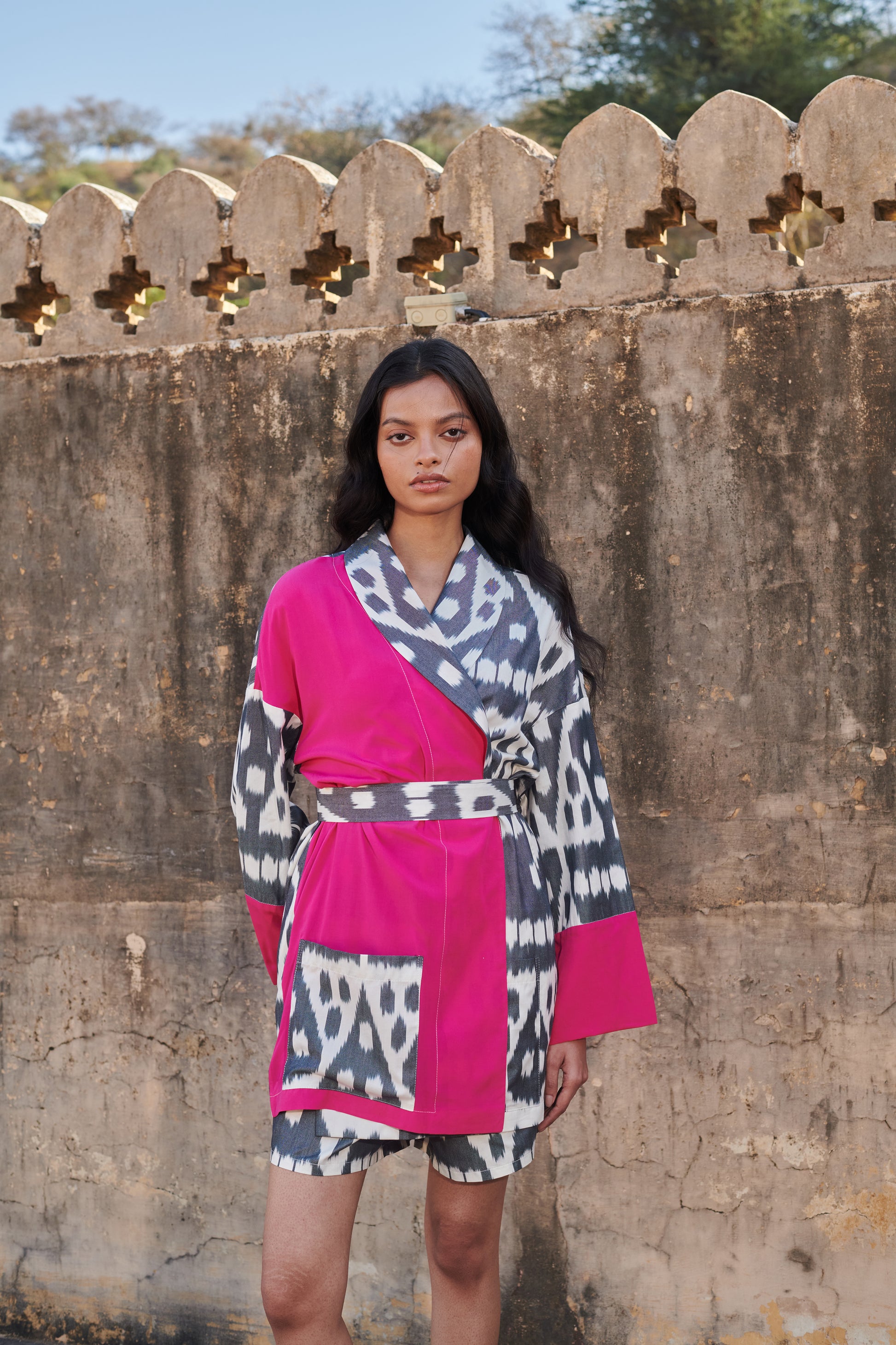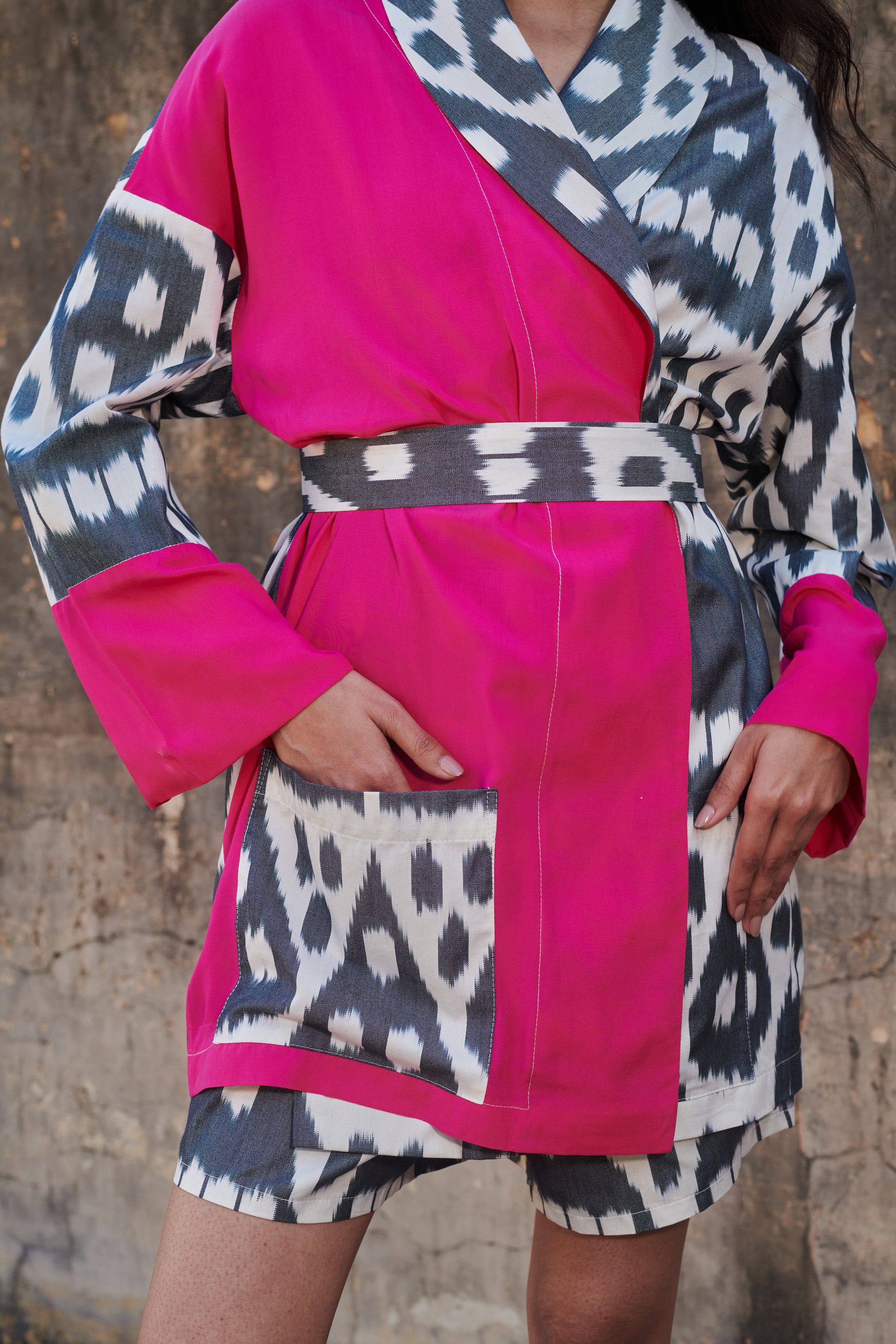 Blending tradition with modern elegance, the Rouge Kimono Blazer boasts a contemporary print in black and white with a contrasting bright pink colour. Vibrant yet timeless, this piece features front patch pockets and is perfect for a day or an evening look.