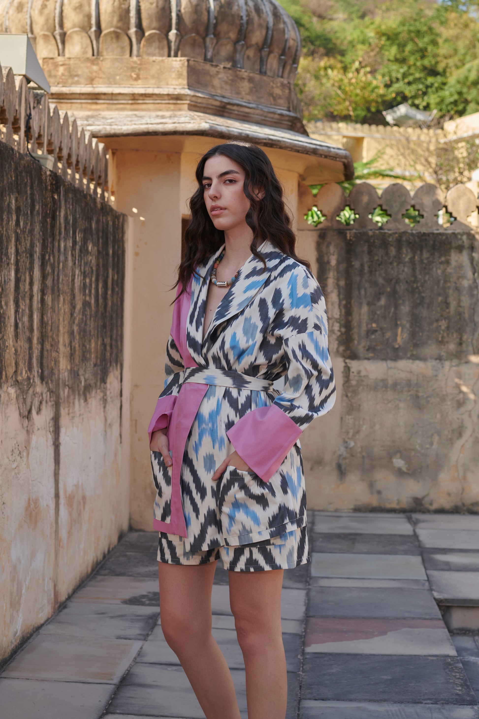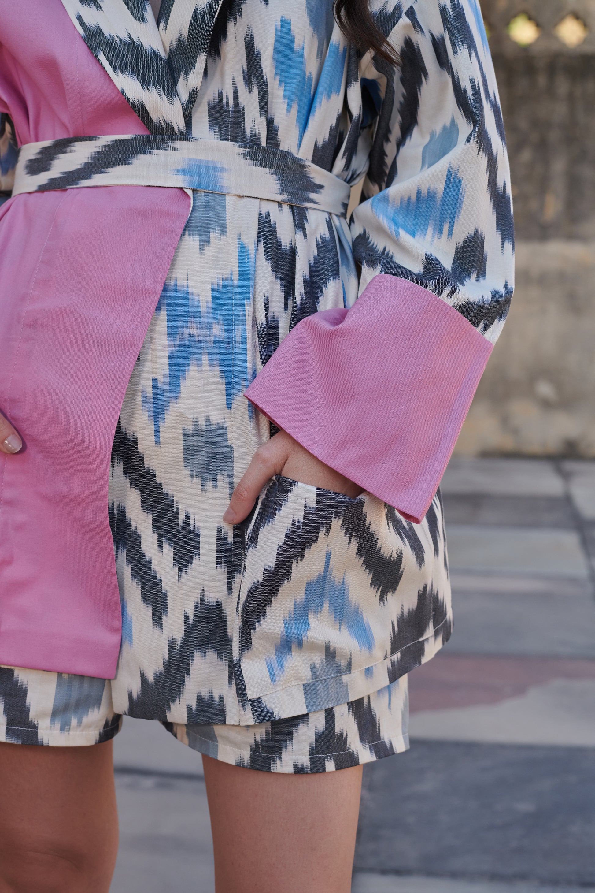 Made from handwoven cotton and silk blend fabric, the Rouge Kimono Blazer Set comes with a kimono style jacket and shorts featuring an add-on belt and front patch pockets. Relaxed silhouette and pastel colours adds to the free-spirited feel.