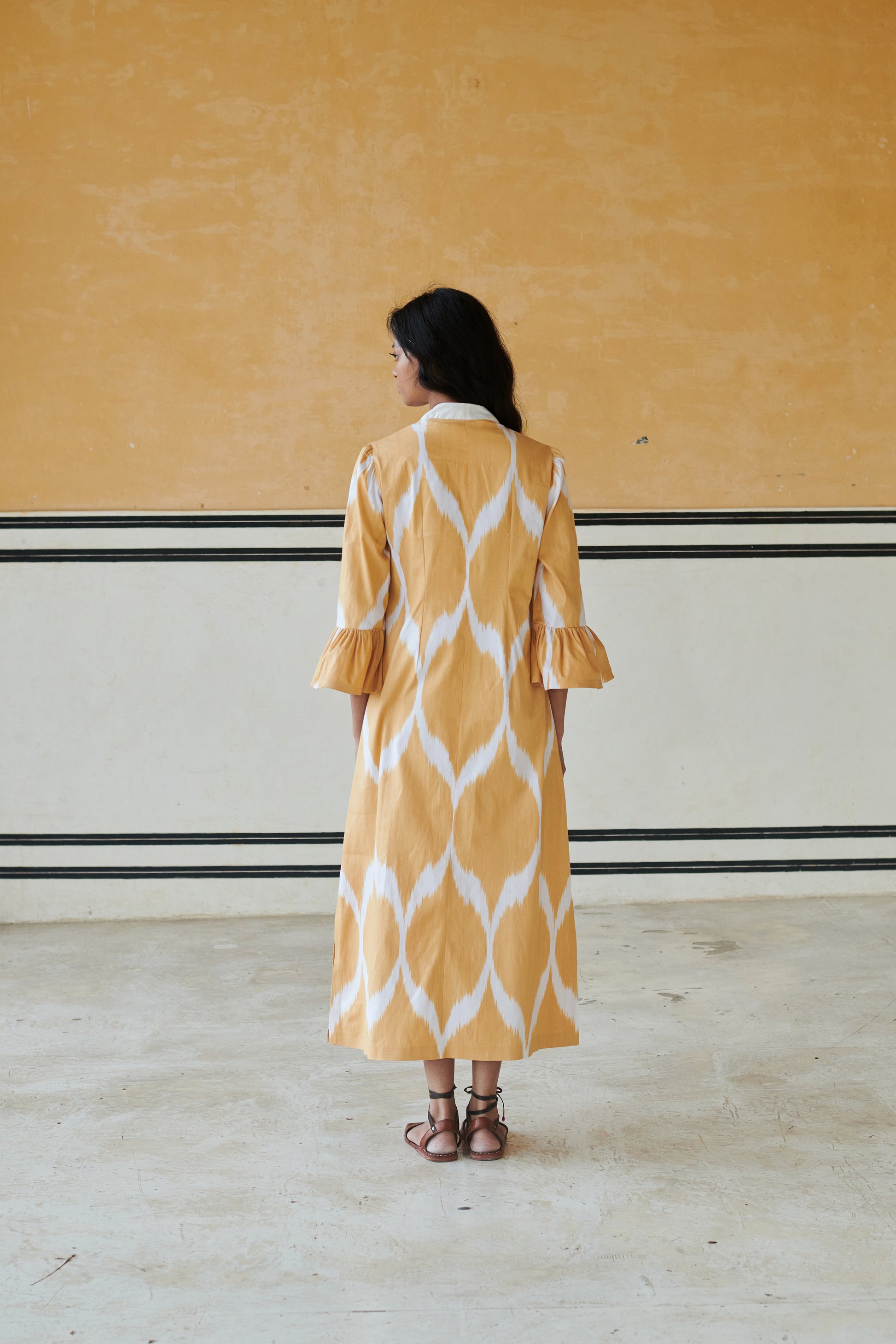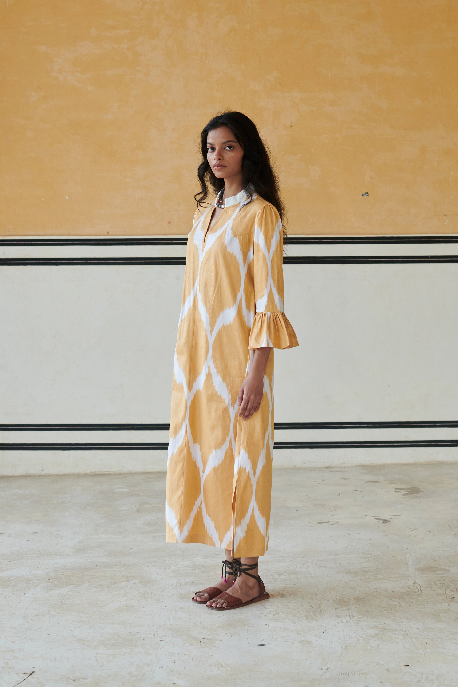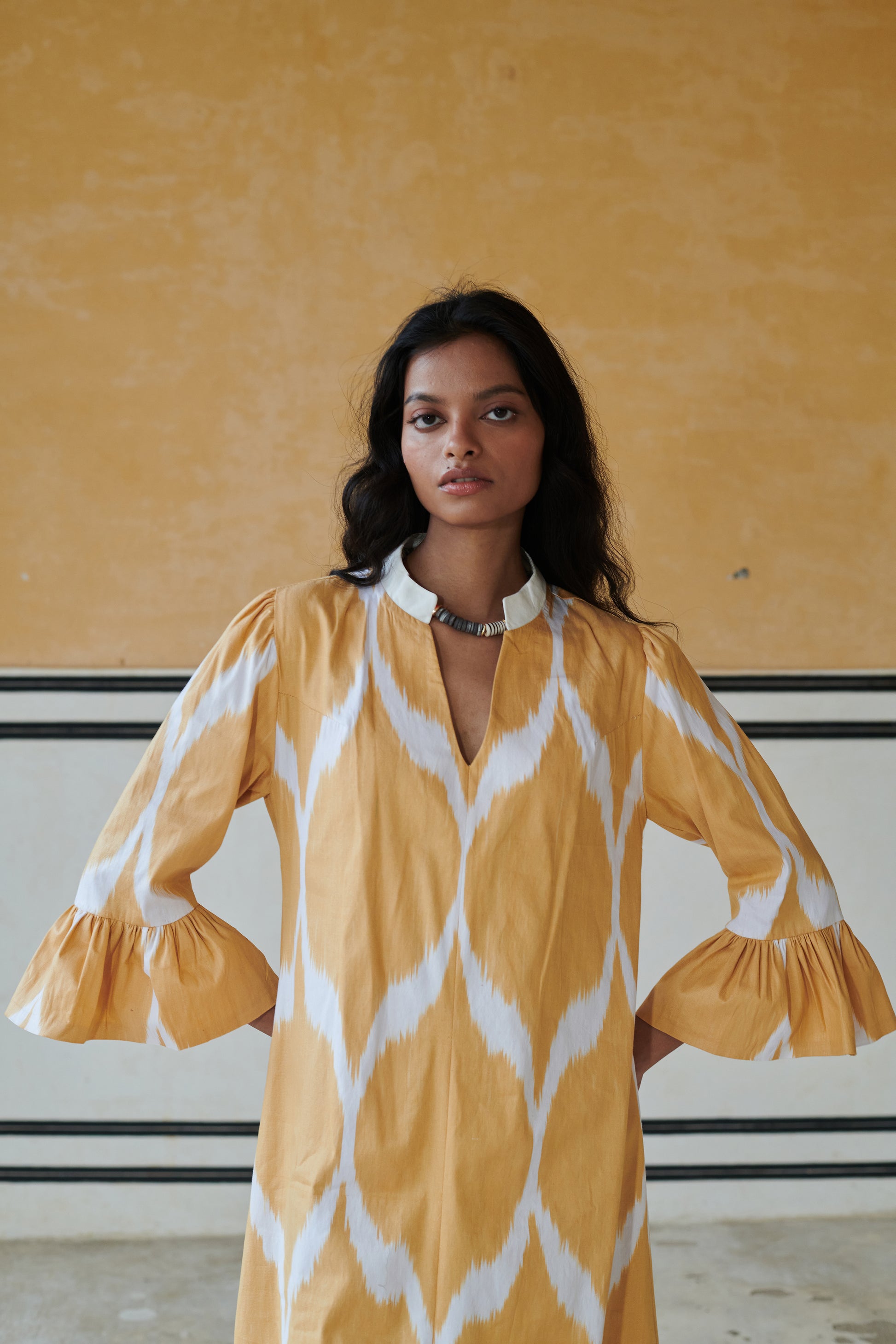 Embrace summer in style with the Samarkand Dress featuring delicate flounce sleeves and side slits. Tailored from yellow cotton and silk blend handwoven fabric, this dress effortlessly combines style and comfort.