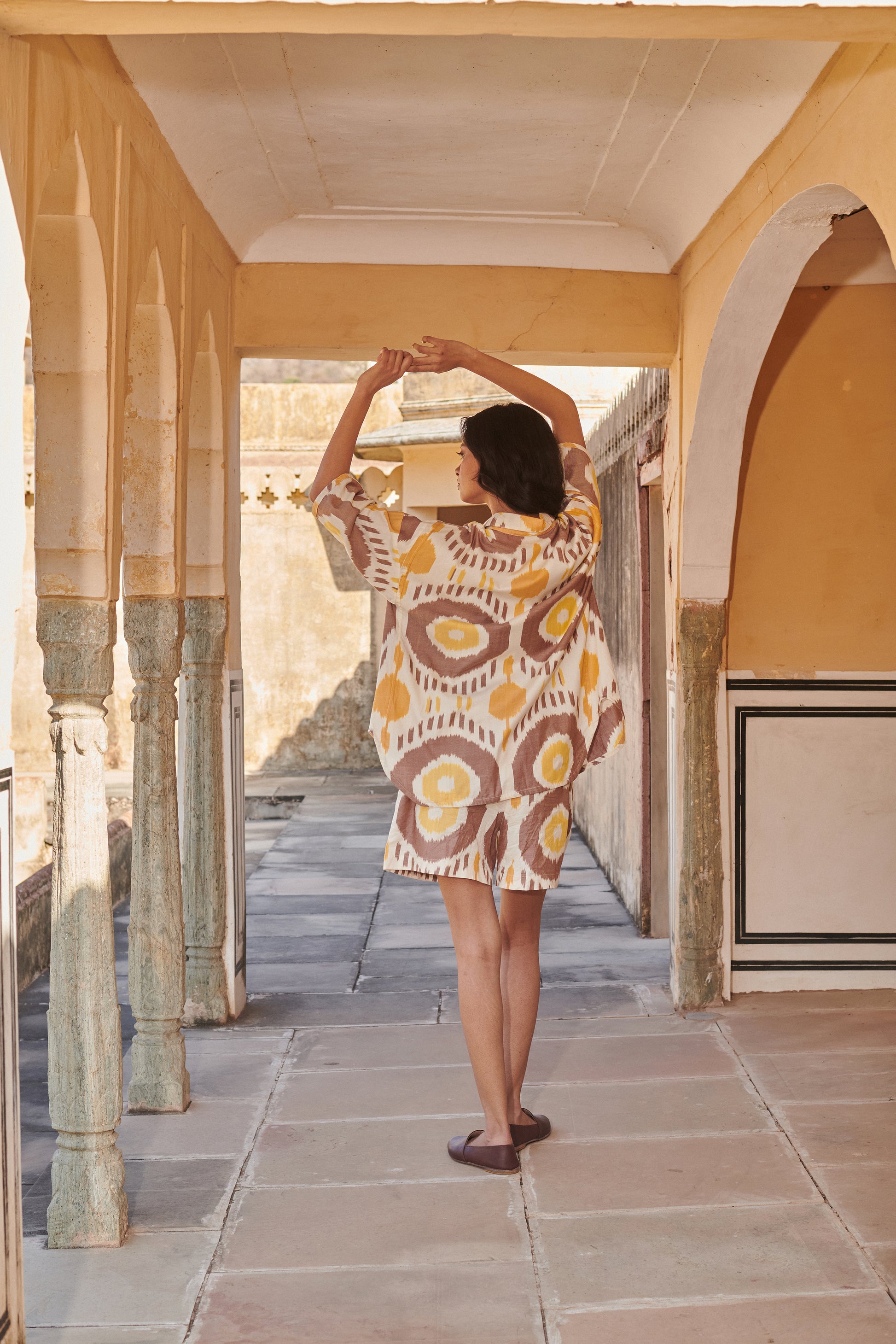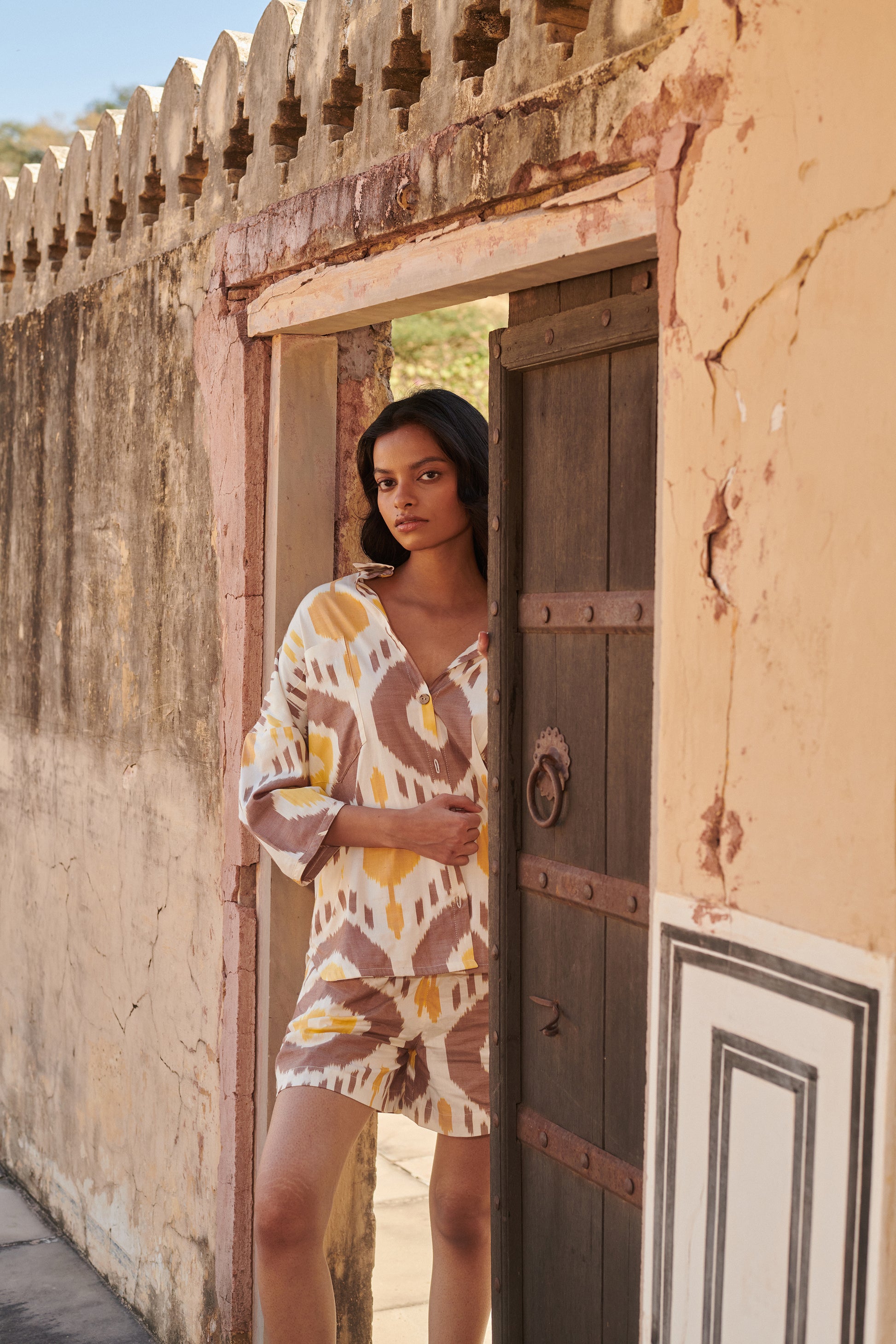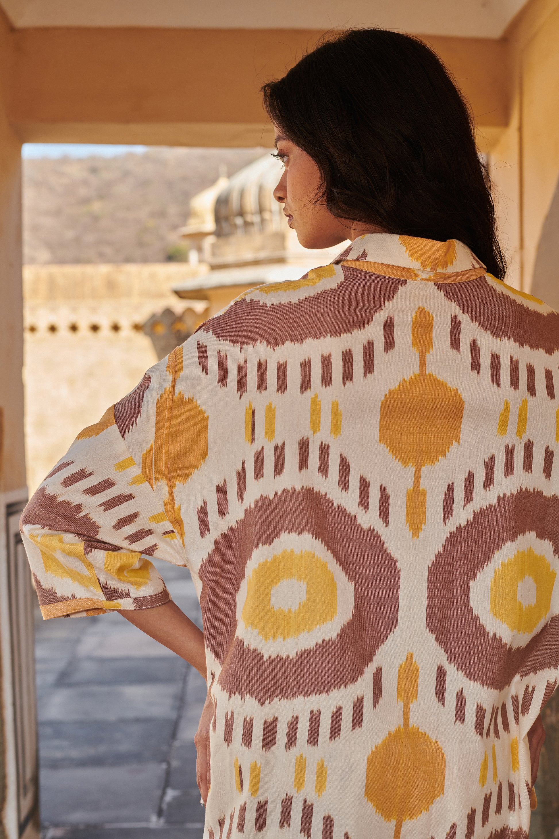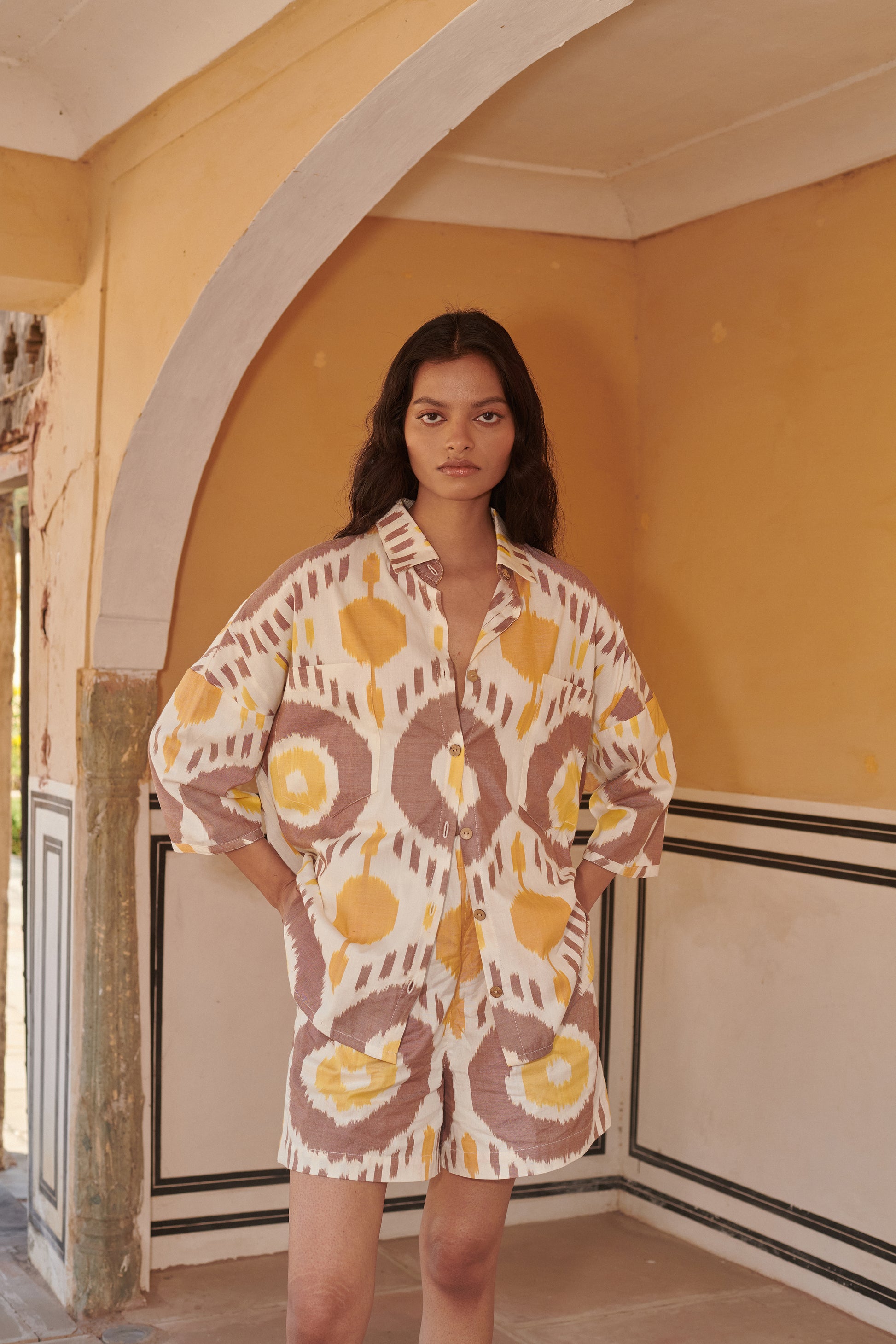 Button down oversized shirt featuring unique ikat pattern and natural colour tone. Merging functional style with breathable fabric, it is ideal for a relaxed day look.