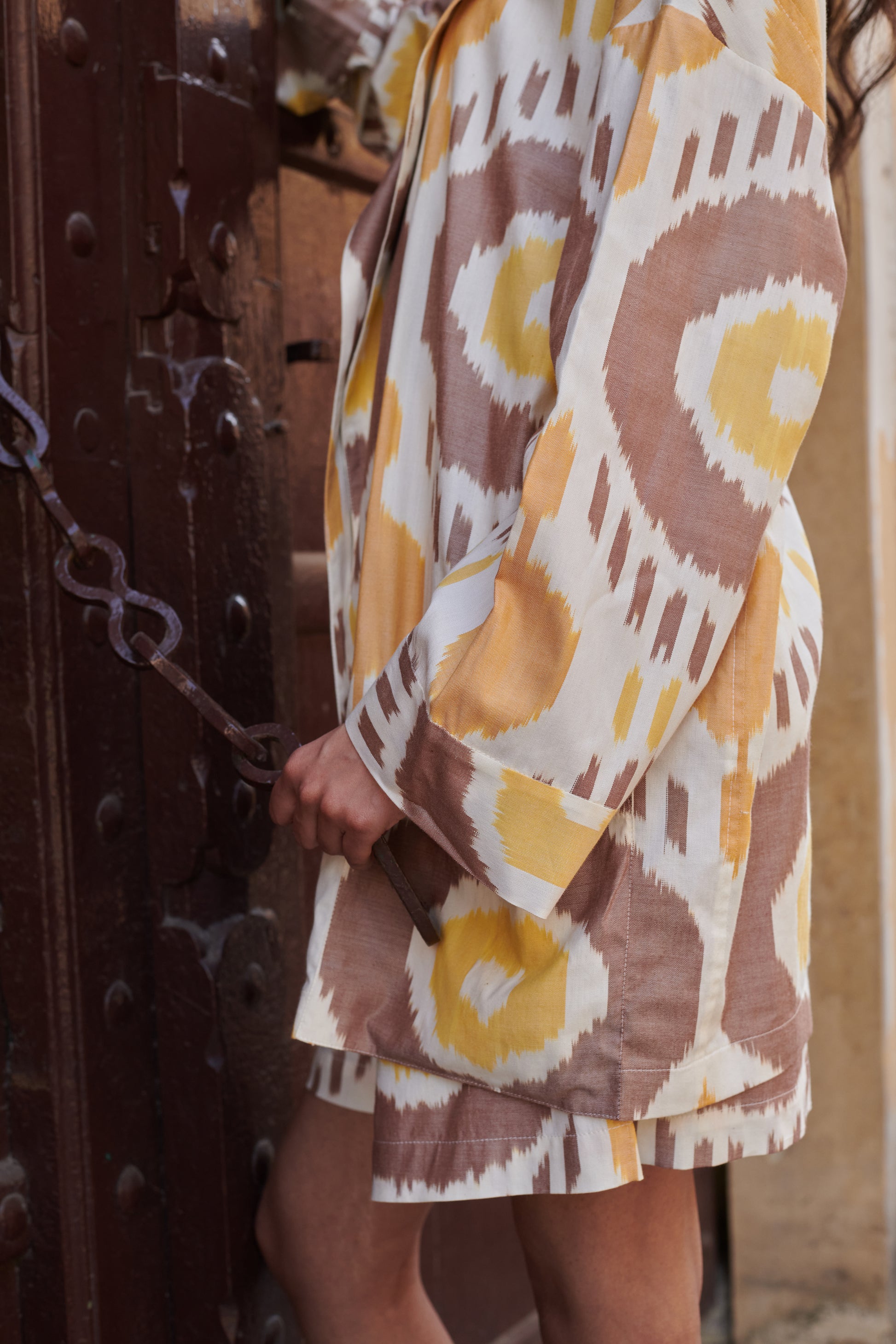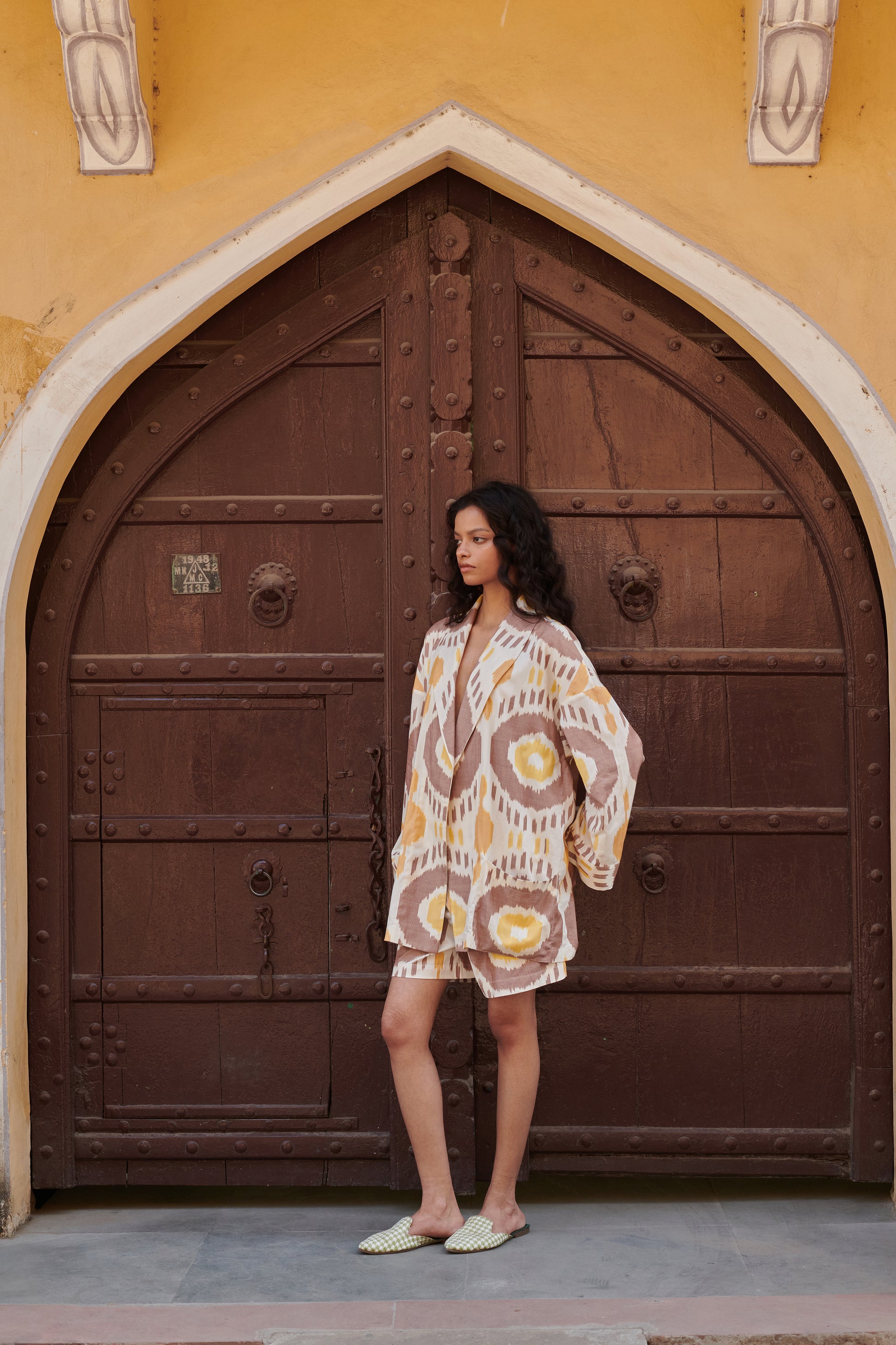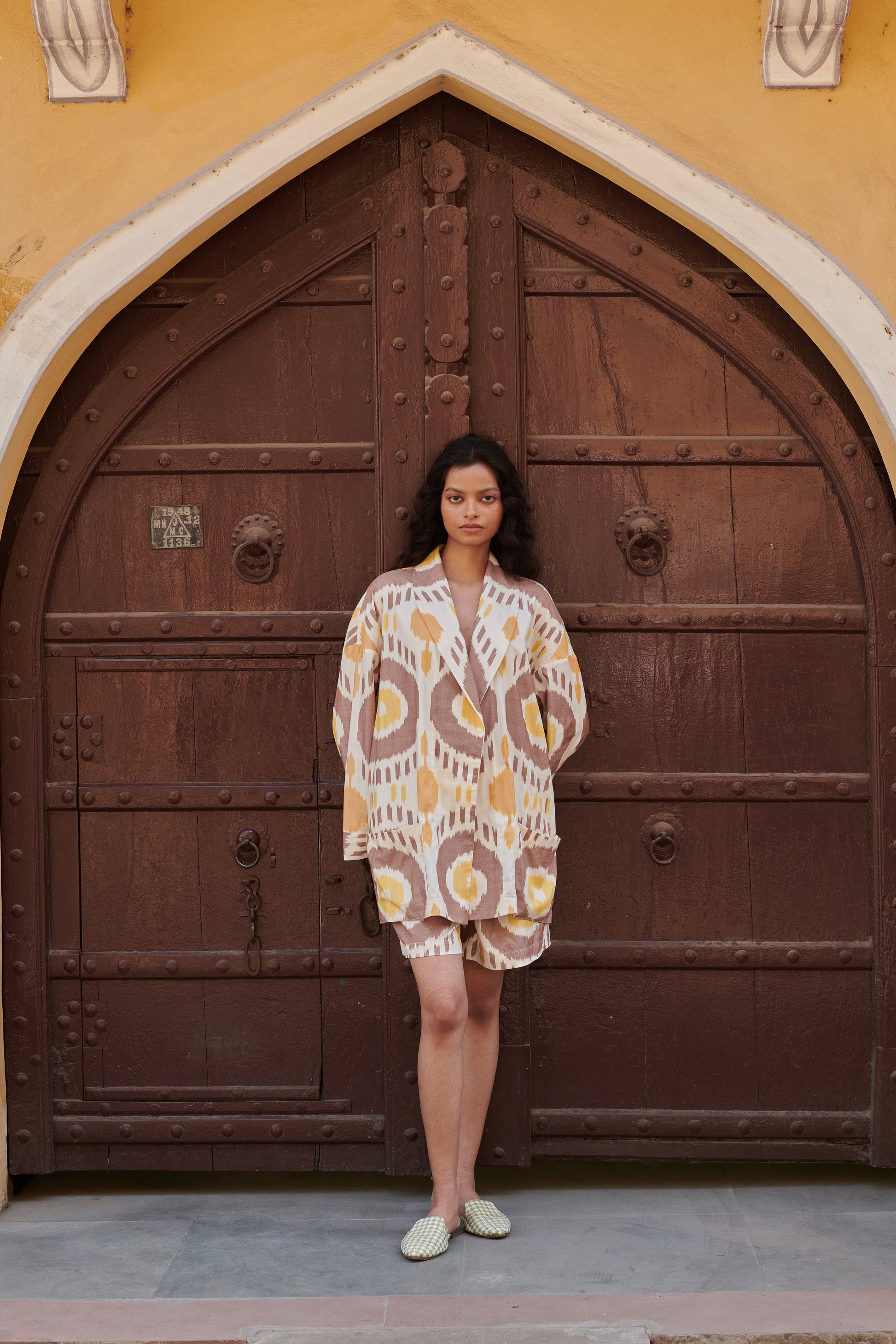 Embracing the essence of earthy yellow and brown hues, the Talaia Kimono Blazer Set comes with an oversized kimono style blazer and matching shorts. Handcrafted with unique ikat pattern, this outfit promises comfort and lightweight flair for every occasion.